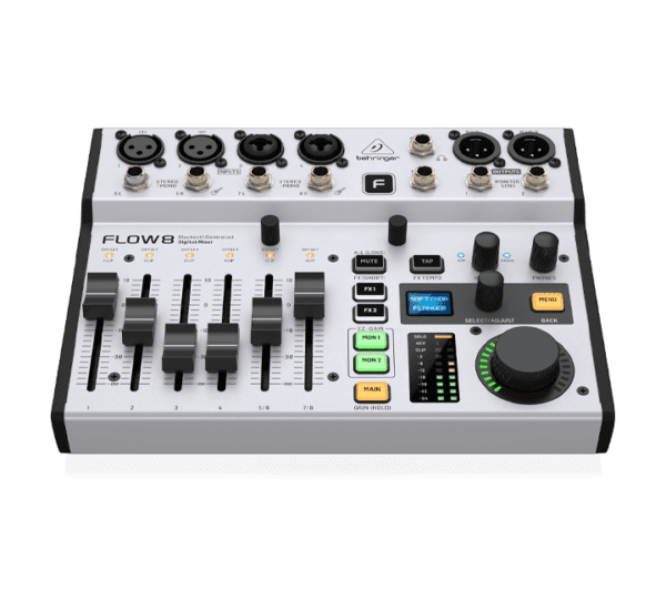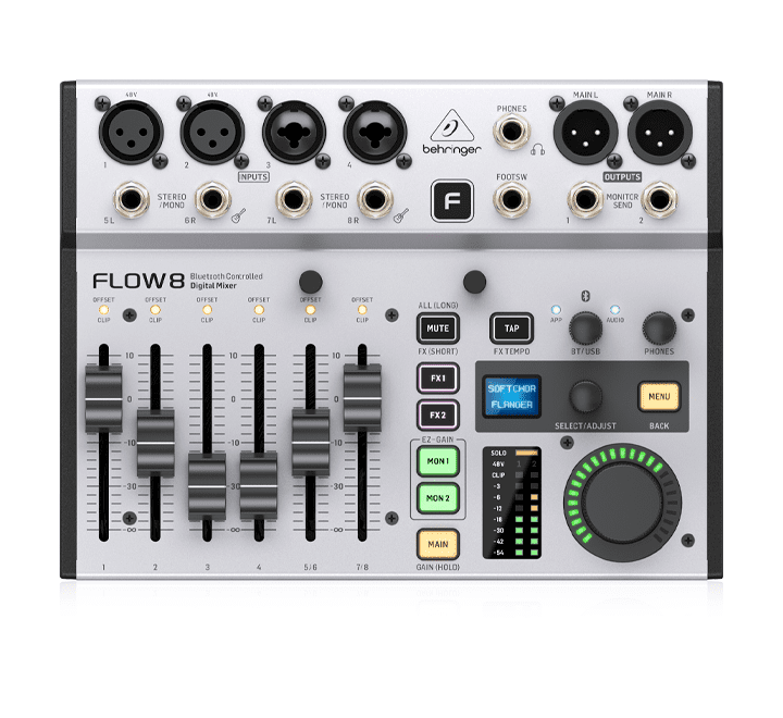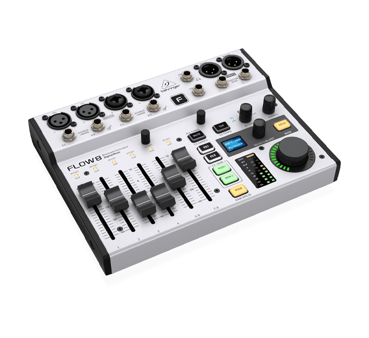 Mezclador FLOW8 BEHRINGER digital 8 canales con preamplificadores Midas. Se destaca por su control remoto completo vía Bluetooth (App FLOW Control), interfaz de audio USB 10×2 para grabación multipista, y efectos de estudio integrados